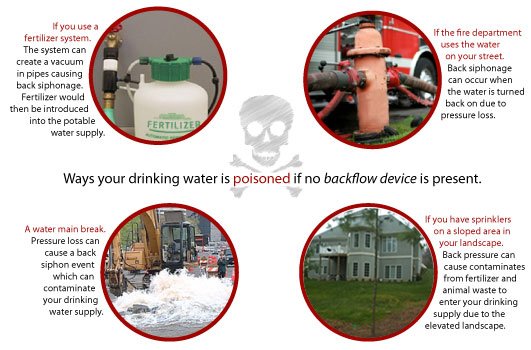 In most homes the landscape irrigation system and the potable water system are one and the same -- there is no separation. Here's where the danger comes in. Sprinkler lines lay in gardens and lawns that are often sprinkled with weed killer, pesticides, and other poisons. Irrigation systems occasionally draw water inward (backwards). This phenomenon is known as a siphon or backflow. Backflow can result in contaminated water at a tap inside the home. Is there any wonder why the building code requires that all outside irrigation lines have some sort of anti-siphon protection?