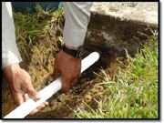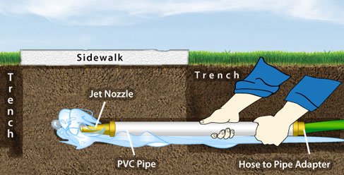 driveways and sidewalks, which at first glance might appear impossible to overcome. Since pipe must go under these obstacles, you will need to find a way to dig a trench without removing the hard surface. The most efficient and cost effective way to bore under an obstacle is to create a hole using the power of water. Simply attach a jet nozzle to one end of a piece of PVC pipe and a garden hose to the other end with the necessary fittings. The force of the water will create a hole the same exact size as your pvc pipe-through to the