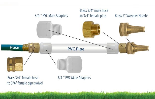 First dig your trenches on either side of the walk to the depth of the rest of your sprinkler system (usually about 6-12 inches minimum). Now using a PVC pipe cutter, cut the piece of schedule 40 PVC pipe about two to four feet longer than the width of your sidewalk or driveway. Following the directions on the can of PVC glue and glue the male adapters on opposite ends of the pvc pipe. Click here for more information on how to use pvc glue. Next, attach the brass 3/4" female hose to 3/4" female pipe swivel to one of the pvc male adapters. Then attach the brass 3/4" male hose to 3/4" pipe fitting to the other pvc male adapter on the opposite side. Connect your garden hose to female pipe swivel adapter. Connect the male hose/female pipe adapter to your 2 inch sweeper nozzle. Your boring tool is now assembled and ready to go.
