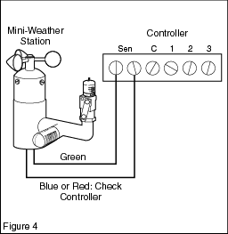 All three sensors are electrically connected in a series, so only two wires need to be used to connect to the irrigation controller. Use the green and silver (clear insulation) wires to hook up to normally-closed logic situations (See Figure 3). Follow the wiring instructions in any of the separate sensor manuals, or place the two wires on the controller's “sensor input” screw terminals if available (See Figure 4). For controllers with normally-open sensor inputs (most Toro models), please consult factory. Note: For extending wires, use wire 18AWG or heavier. |