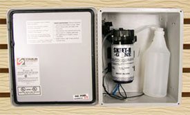 Liquid concentrate is injected into an existing sprinkler system by a 160 PSI pump that is housed in an exterior enclosure. This enclosure also houses the concentrate. |